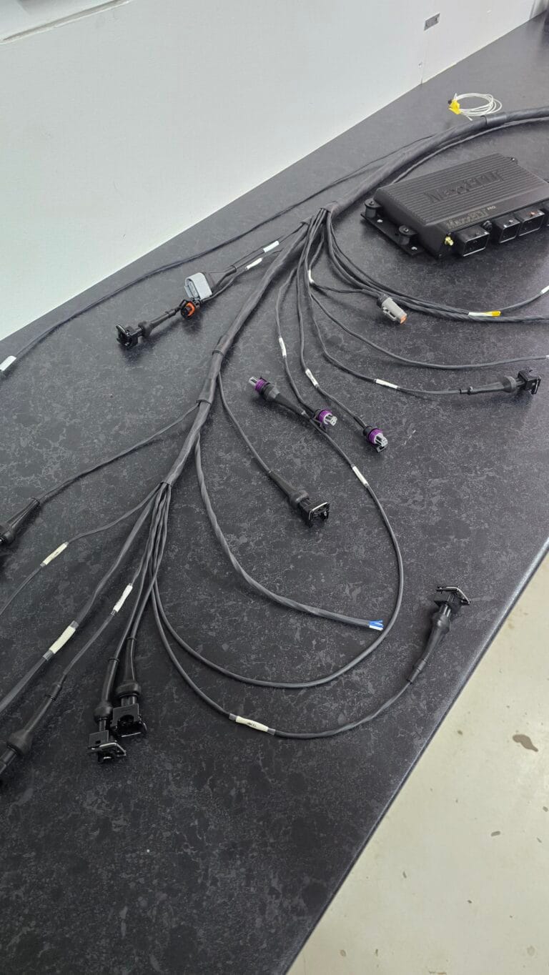 As part of the conversion, we updated the bulkhead connector, added wiring for additional sensors and control functions, and built a new harness to suit. We also installed a MaxxECU MDash, while retaining the existing rotary switch setup for boost control and fuel selection.